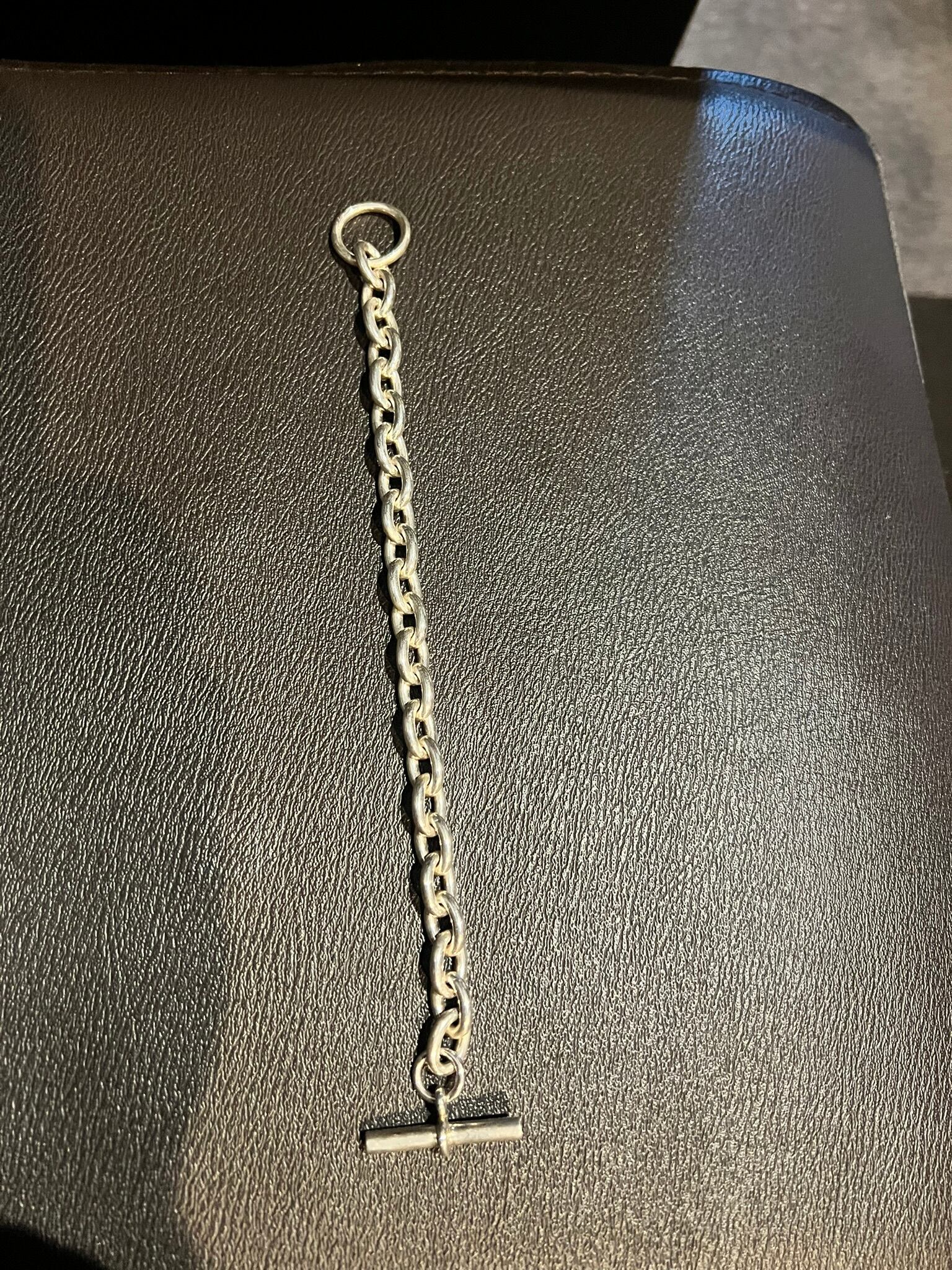 このブレスレットは、太く長めのサイズ感が特徴で、手首にしっかりとフィットします。USED品ですが、その分独特の風合いが増し、どんなスタイルにもマッチします。おしゃれなアクセントとして、カジュアルからフォーマルなシーンまで幅広く活躍するアイテムです。高品質なシルバーメタルを使用しており、耐久性も持ち合わせていますので、長くご愛用いただけます。